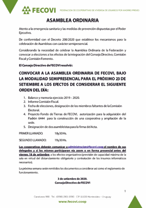 Asamblea Ordinaria Públicado en septiembre 7, 2020octubre 20, 2020 por comunicacion El consejo Directivo de FECOVI convoca a Asamblea Ordinaria… DESCARGAR ASAMBLEA ORDINARIA 23 09 2020