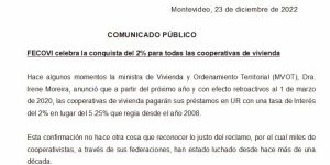 Montevideo, 23 de diciembre de 2022 FECOVI celebra la conquista del 2% para todas las cooperativas de vivienda Hace algunos momentos la ministra de Vivienda y Ordenamiento Territorial (MVOT), Dra. …