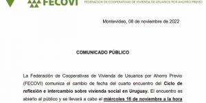 Montevideo, 08 de noviembre de 2022 COMUNICADO PÚBLICO La Federación de Cooperativas de Vivienda de Usuarios por Ahorro Previo (FECOVI) comunica el cambio de fecha del cuarto encuentro del Ciclo …