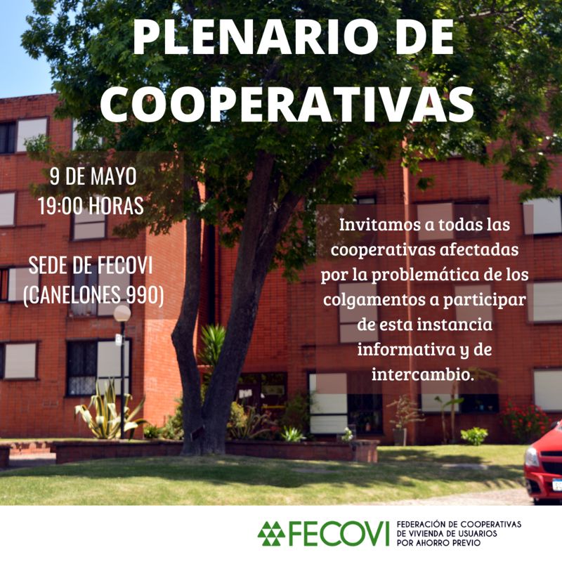 El Consejo Directivo de FECOVI convoca a un Plenario de cooperativas para el martes 09 de mayo a las 19:00 horas en la sede social (Canelones 990, Montevideo). Invitamos a todas las cooperativas afectadas por la problemática de los colgamentos a participar de esta instancia informativa y de intercambio.