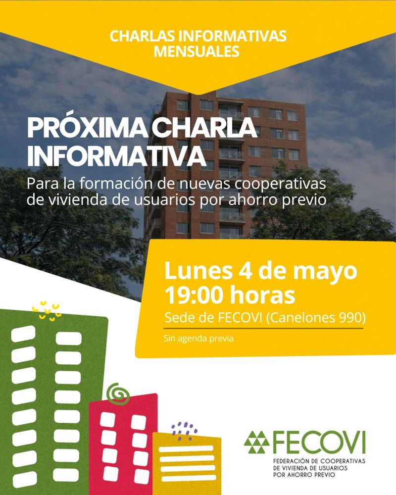 Charla informativa para la formación de nuevas cooperativas de vivienda + Añadir Google Calendar + exportación iCal / Outlook 00 días 00 horas 00 minutos 00 segundos Fecha May 04 2026 Hora 7:00 pm Localización Sede Central FECOVI Canelones 990 Esq. J.Herrera y Obes Categoría Eventos Compartir este evento