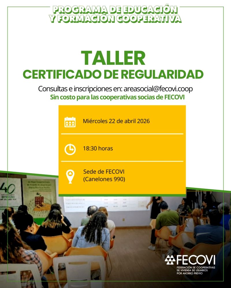 Taller: Certificado de Regularidad + Añadir Google Calendar + exportación iCal / Outlook 00 días 00 horas 00 minutos 00 segundos Fecha Abr 22 2026 Hora 6:30 pm Localización Sede Central FECOVI Canelones 990 Esq. J.Herrera y Obes Categoría Eventos Compartir este evento