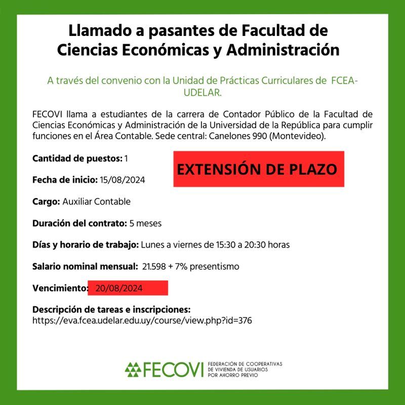 Extensión de plazo para el llamado a pasantes de FCEA para el Área Contable de FECOVI Públicado en agosto 8, 2024agosto 8, 2024 por comunicacion