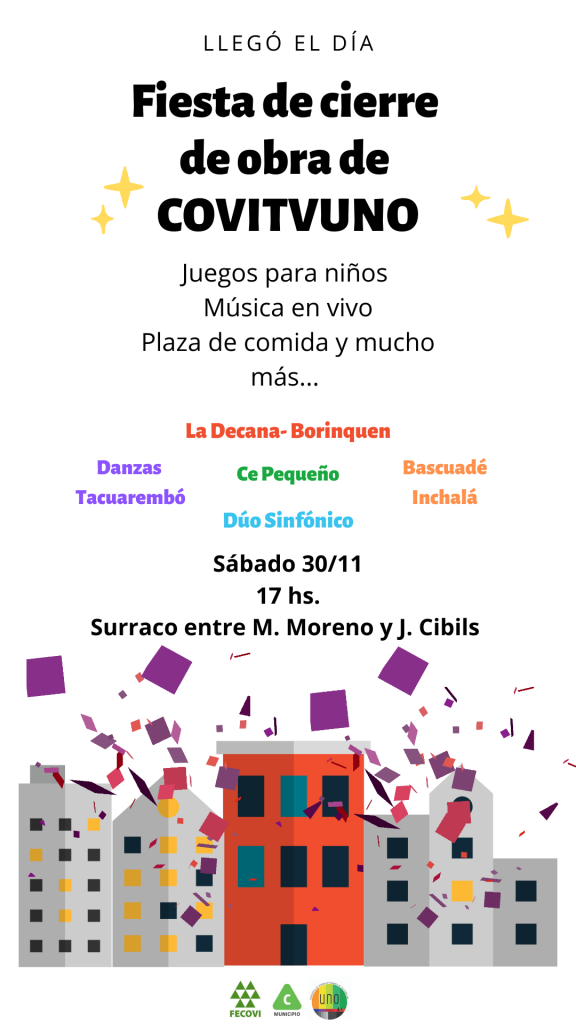 Fiesta de cierre de obra de cooperativa COVITV1 Públicado en noviembre 28, 2019noviembre 28, 2019 por comunicacion Los compañeros de Covitvuno celebrarán este sábado 30 de noviembre el cierre de su obra, e invitan a participar del festejo que realizarán a las 17.00 horas en su cooperativa (Surraco entre M. Moreno y J. Cibils).
