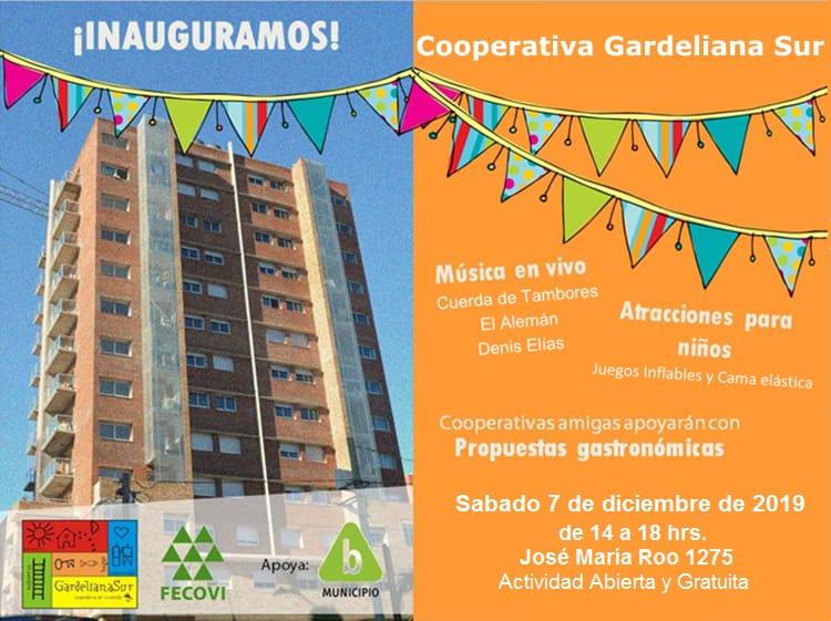 Invitamos a la fiesta de inauguración de la Cooperativa Gardeliana Sur, que se realizará el próximo sábado 7 de diciembre de 14.00 a 18.00 horas en José María Roo 1275. Habrá música en vivo, atracciones para niños y variadas propuestas gastronómicas. ¡Los esperamos!