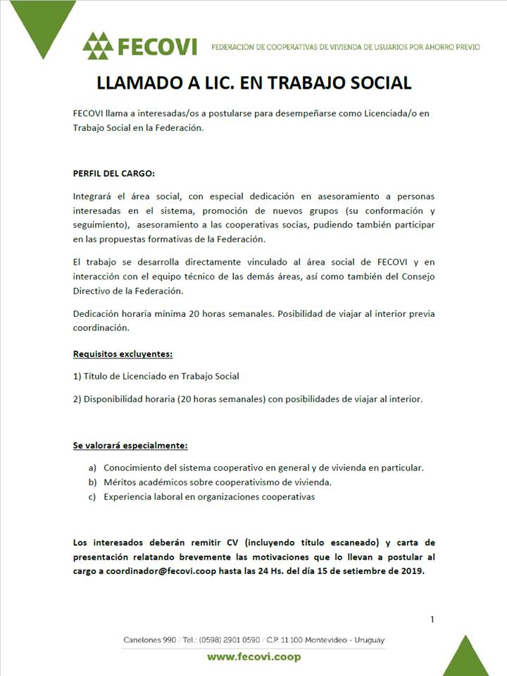 FECOVI llama a interesados/as a postularse para desempeñarse como Licenciada/o en Trabajo Social en la Federación. Los/as interesado/as deberán remitir CV (incluyendo título escaneado) y carta de presentación relatando brevemente las motivaciones que lo llevan a postular al cargo, a coordinador@fecovi.coop hasta las 24 h del día 15 de setiembre de 2019.