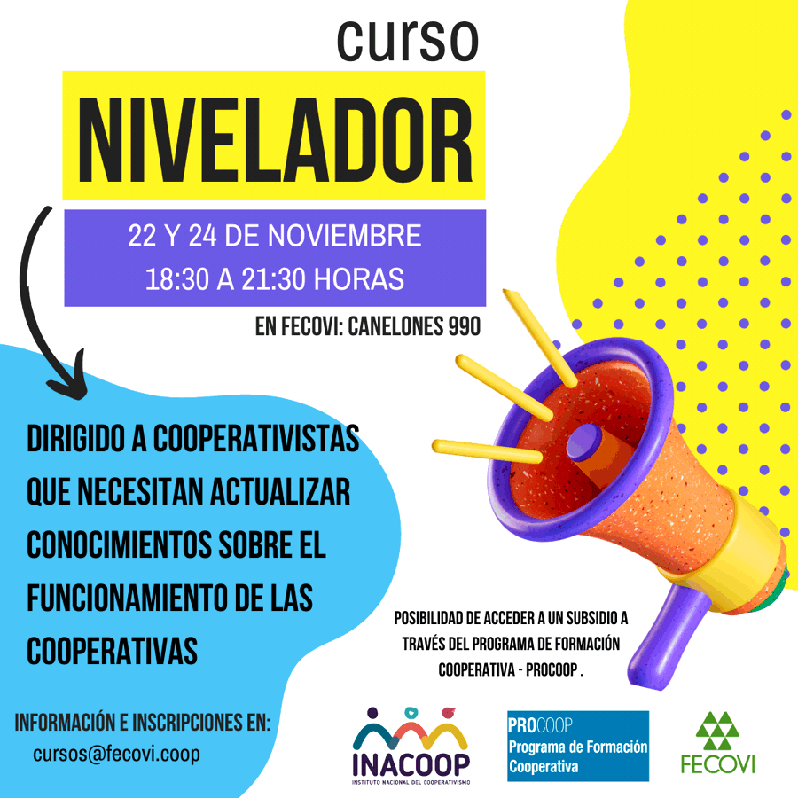 Reprogramación del Curso Nivelador 2023 Públicado en noviembre 10, 2023noviembre 10, 2023 por comunicacion La edición 2023 del Curso Nivelador se llevará a cabo los próximos miércoles 22 y viernes 24 de noviembre en la sede de FECOVI (Canelones 990) en el horario de 18:30 a 21:30 horas.